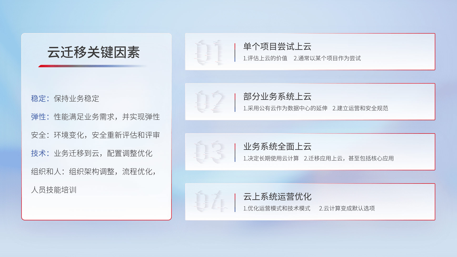 结合实际业务,,,从规划设计、、、云平台选型、、、、云原生改造、、、数据迁移、、集成交付,,迁移全过程为客户识别最佳上云路径,,,,做好风险识别管理,,,设计网络架构、、、、身份权限、、、、安全审计合规、、、操作审计、、、、日志审计、、、、监控告警策略、、、多站点容灾设计等,,对云上基础设施进行整体规划,,,提升IT治理水平,,,以满足弹性、、高可用、、高性能的需求。。。