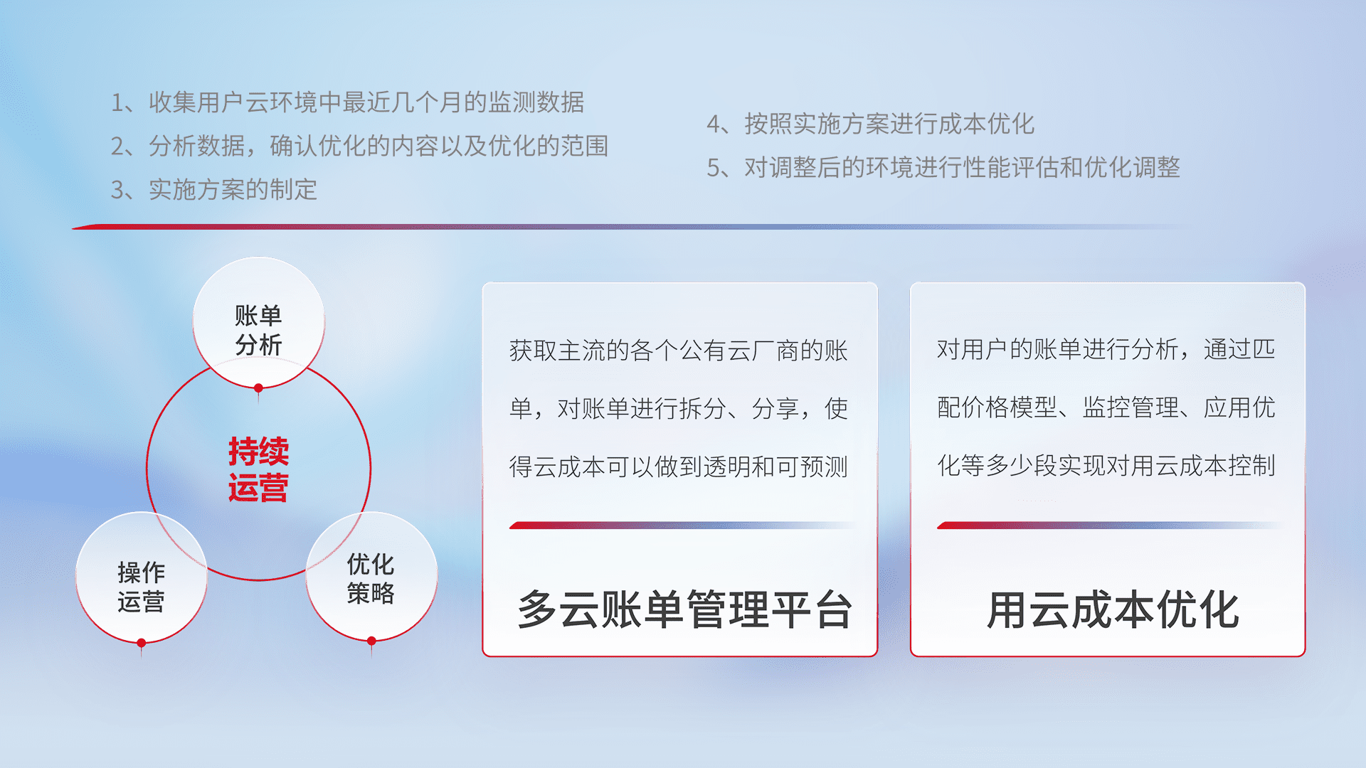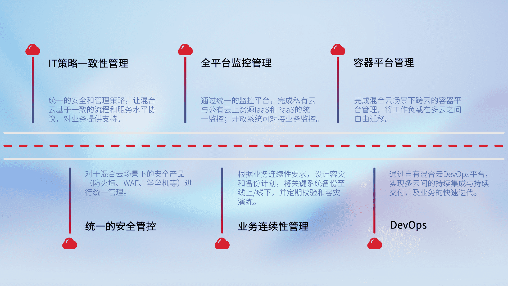 通过多云纳管,,,,以统一的资源数据模型把客户的云资源进行抽象和封装,,,,进而实现对多云资源的统一操作,,,,保障云资源管理的可靠性、、、、稳定性与可用性。。。量身定制化运维内容,,,,配置、、、、开发运维、、、、补丁管理、、、、备份、、监控、、、认证和访问管理、、审计和日常巡检等,,保障在用云过程中的可靠度,,稳定度以及高可用率。。